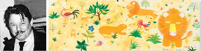 Maik designates himself as a Primitive painter, not a naïf painter. In many ways, the paintings of Henri Maik are paradoxical, at once familiar and strange, childlike and sophisticated, quiet and vocal with color. They are dreamscapes; their terrain lush with fields of simple flowers, exotic trees, rare birds and the beasts of the jungle. In a Maik painting, you enter a community of creatures, at rest and at play, dwelling in perfect harmony, who seem to look out at us, as if to suggest we might do as they are doing.